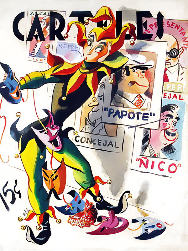 Portada de la revista Carteles. Ilustración de Andrés García Benítez. El carnaval de las elecciones: los políticos cambian de careta con mucha facilidad.
