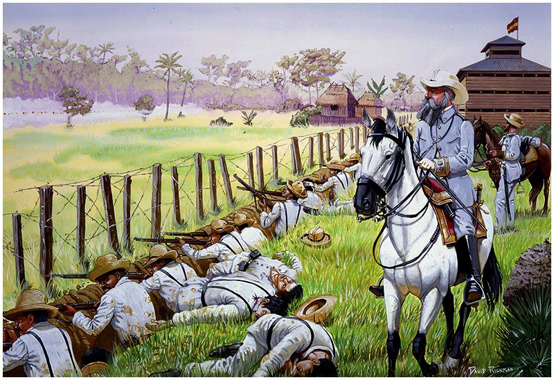 Los uniformes de los soldados coloniales españoles antes y durante la Guerra Hispanoamericana de 1898 estaban hechos de una característica tela a rayas azules y blancas, llamada "rayadillo".