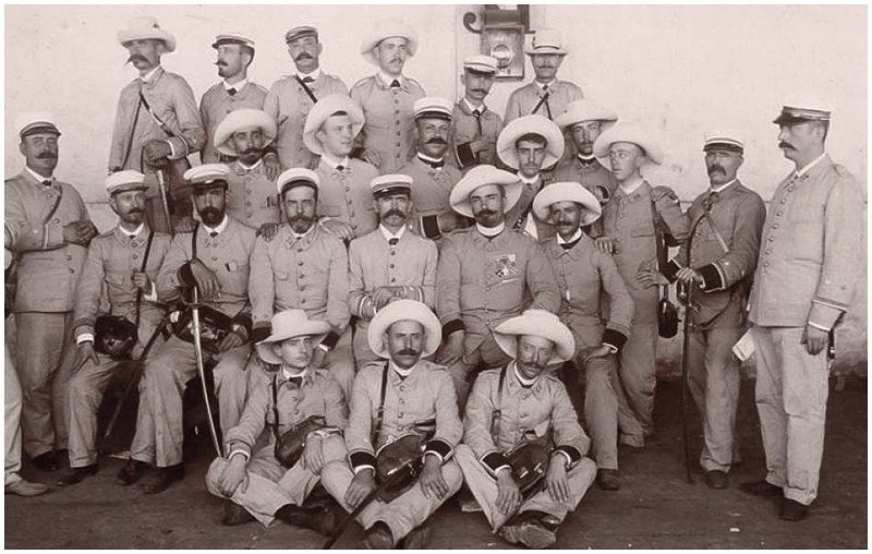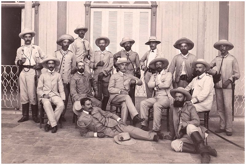El grupo está compuesto por quince oficiales con traje de rayadillo distribuidos en tres filas, los de la última de pie, llevan sable, y en el centro el general Montaner. Fotografía que se guardaba en el antiguo Igenio Santa Teresa.