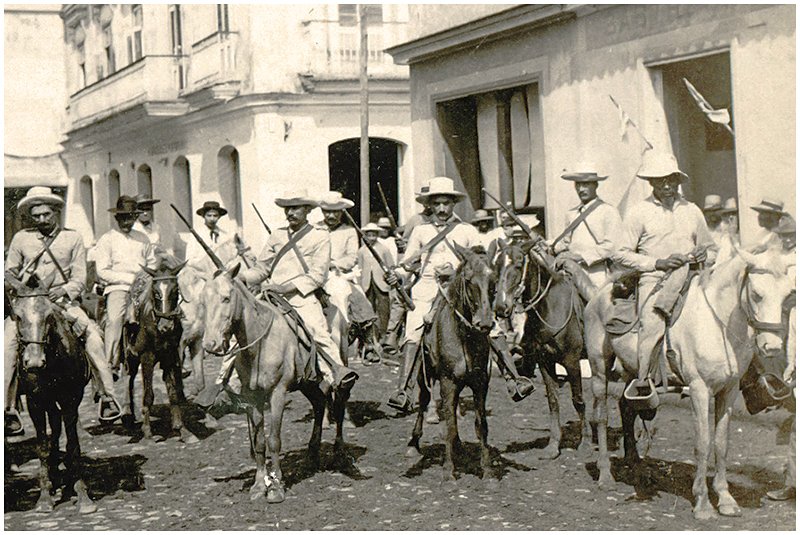 Grupo de mambises insurgentes a caballo en una calle de la ciudad Santa Clara