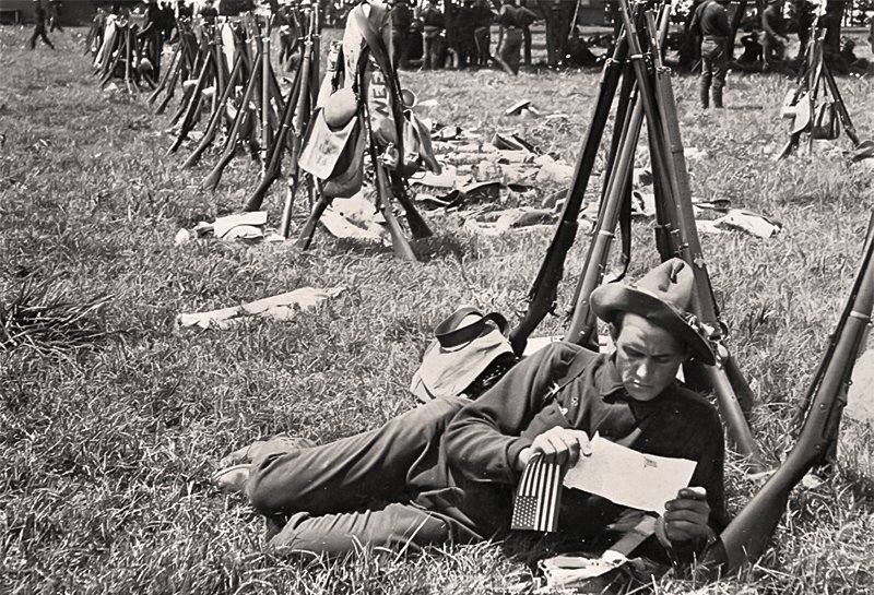 Soldado norteamericano leyendo una carta durante un descanso en el campo de batalla