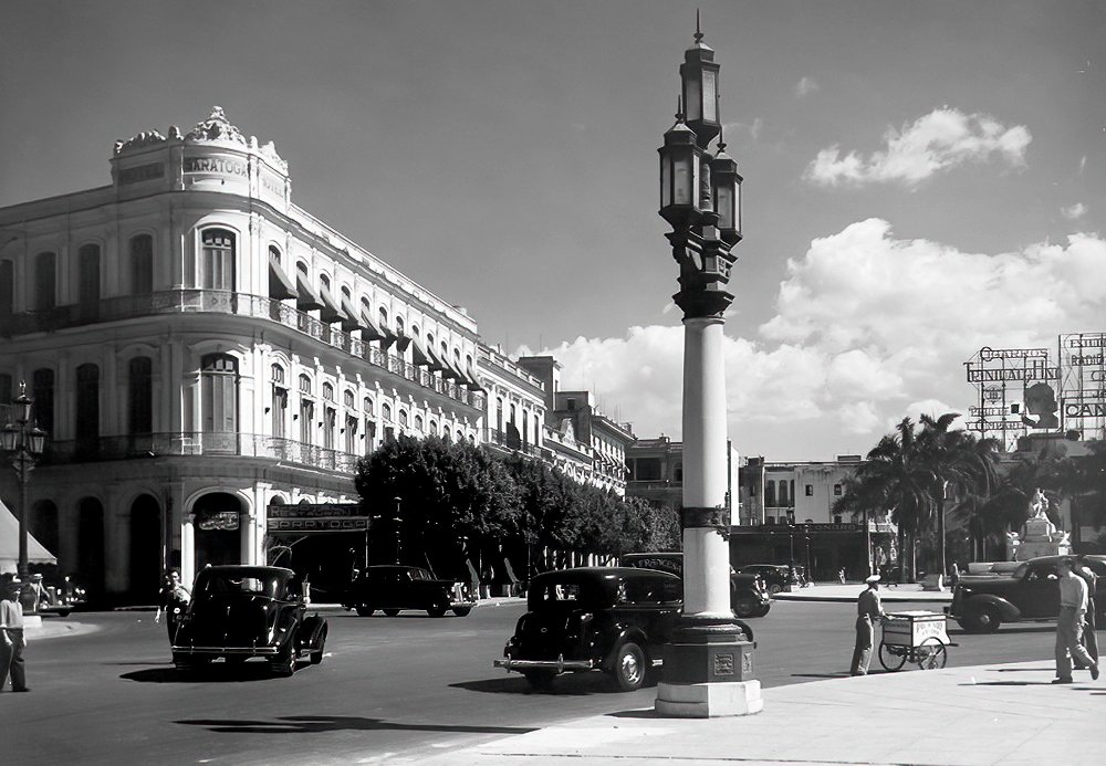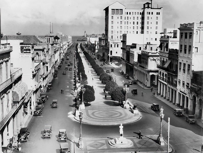 Vista del Paseo del Prado, donde destaca a la derecha el edificio del Hotel Sevilla. La Habana.