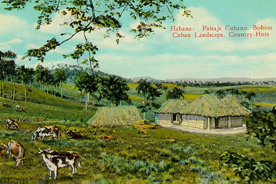 Paisaje del campo cubano, con el ganado, las palmas reales y los típicos bohíos campesinos.