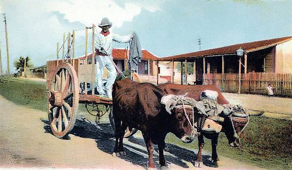 Campesino montado en su carretón de bueyes en una aldea cubana.
