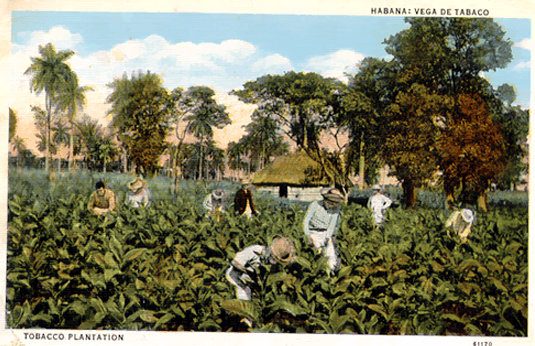 Familia de campesinos trabajando en la faena del tabaco frente a su bohío.