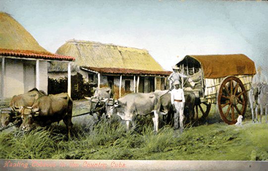 Carretones tirados por dos yuntas de bueyes preparados para el transporte de tabaco.