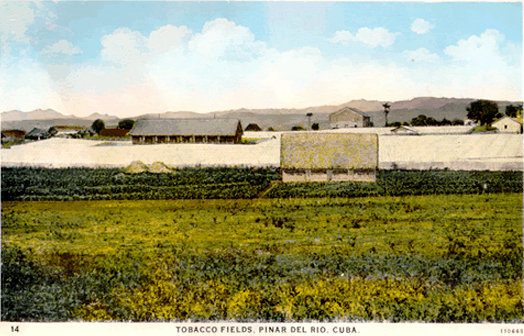 Plantación de tabaco bajo cubierta con las casas de tabaco entre la vega.