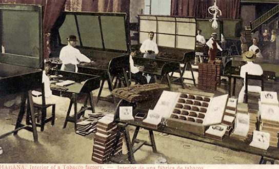 Interior de una fábrica de manufactura de tabacos puros en La Habana.