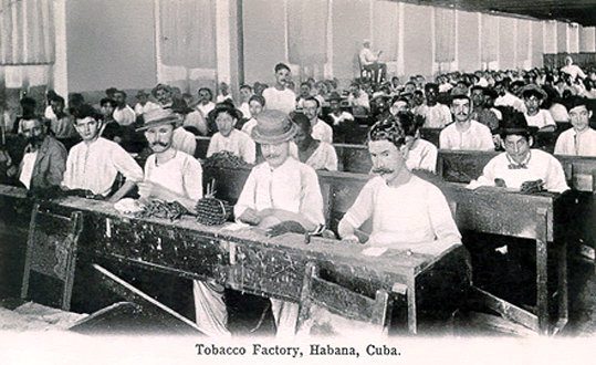 Fábrica de puros habanos con el lector sentado en una silla alta en medio de la sala.