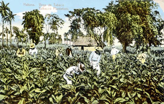 Campesinos deshijando las matas de tabaco en los campos de Cuba.