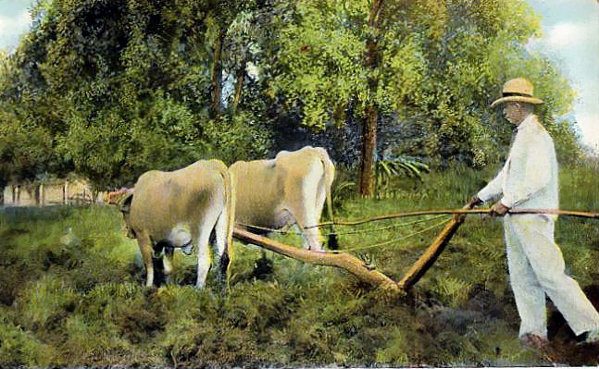 Campesino arando con su yunta de bueyes en los campos de Cuba.