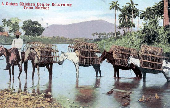 Vendedor ambulante con su reata de mulas cargada de jaulas de pollos y gallinas.