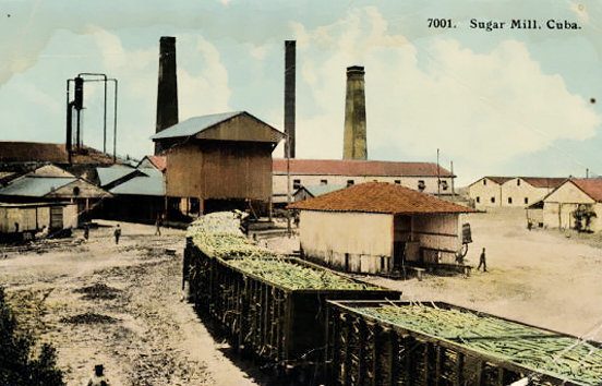 Tren de caña de azúcar llegando a una antigua central azucarera.