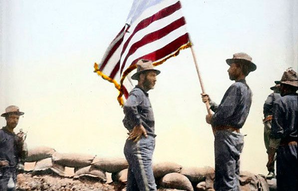 Guerra hispano-norteamericana en 1898. Soldado enarbolando la bandera norteamericana en las Alturas de San Juan, Santiago de Cuba.