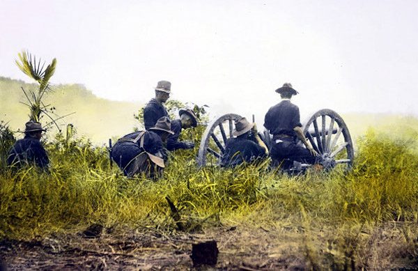 Guerra hispano-norteamericana en 1898. Quinto batallón del Ejército de Artillería norteamericana en las Alturas de San Juan, Santiago de Cuba.