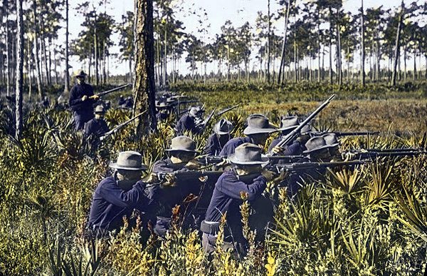 Guerra hispano-norteamericana en 1898. Quinto Cuerpo de Infantería del Ejército norteamericano apuntando con sus rifles, Cuba.