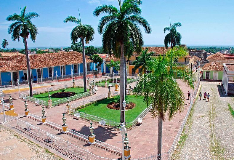 La Plaza Mayor de la ciudad de Trinidad, ejemplo de estilo colonial cubano de los pasados siglos, con sus elegantes palmeras y sus dos galgos de bronce custodiando la entrada a la plaza.