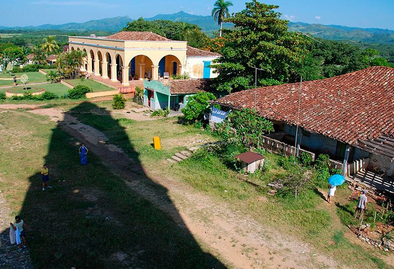 Patio del antiguo ingenio Manaca-Iznaga, en el que se proyecta la sombra de su gran torre, de 45 m de altura y desde la que se vigilaba el trabajo de los esclavos.